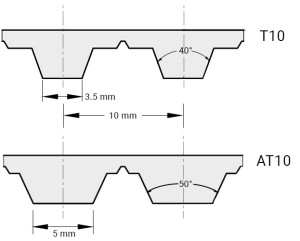 Timing belts are available in a variety of series and pitches. Pitch is the distance between teeth from tooth centre to tooth centre. Series refers to the style or profile of the teeth and provides an additional method of categorising the belt. Timing belt teeth can be round or trapezoidal, both of which may also vary by series. See the example below showing a T10 timing belt and an AT10 timing belt - both with a 10mm pitch.